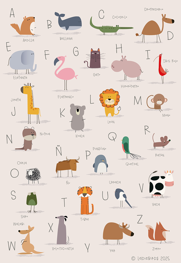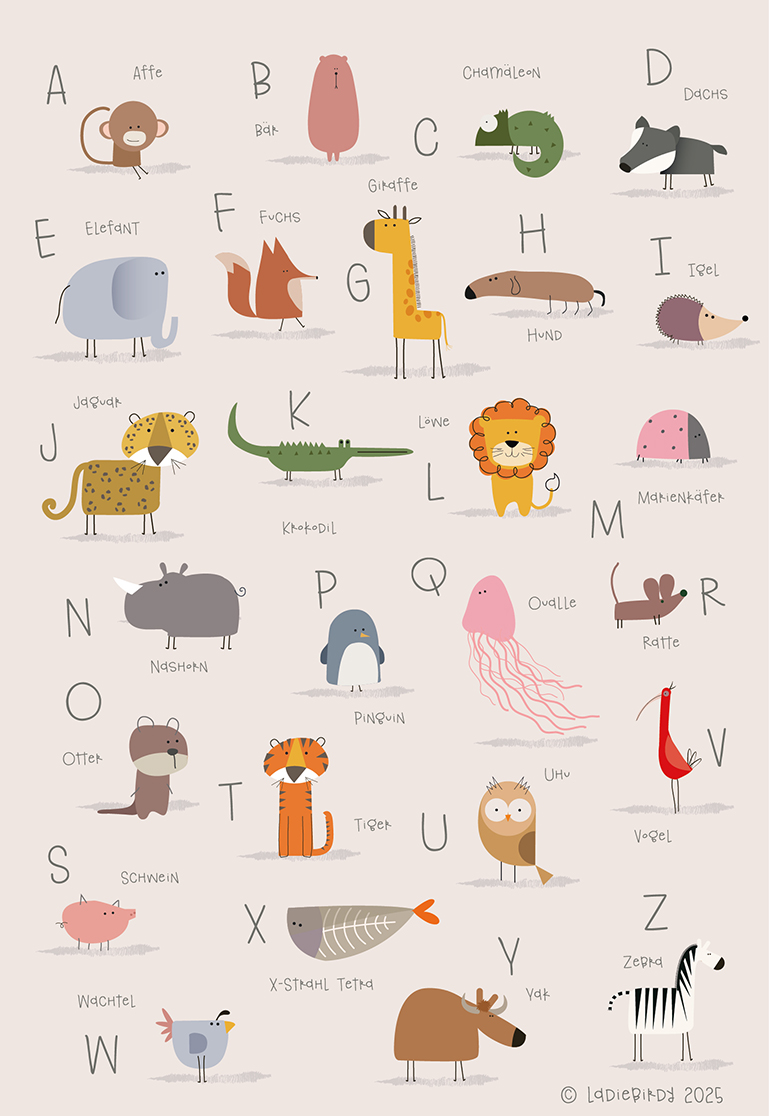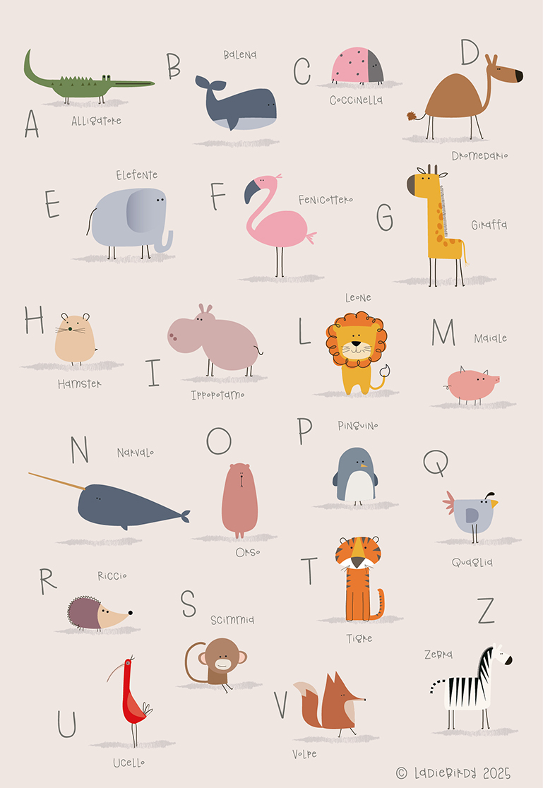 Beautiful Animal Alphabet A3 Art Print. Great for young children to learn both animals and their abc’s.  It is a perfect gift for a  little one or baby shower Looks fantastic in a child’s Room. All my prints are printed to the highest quality, on beautiful Italian Art Card.