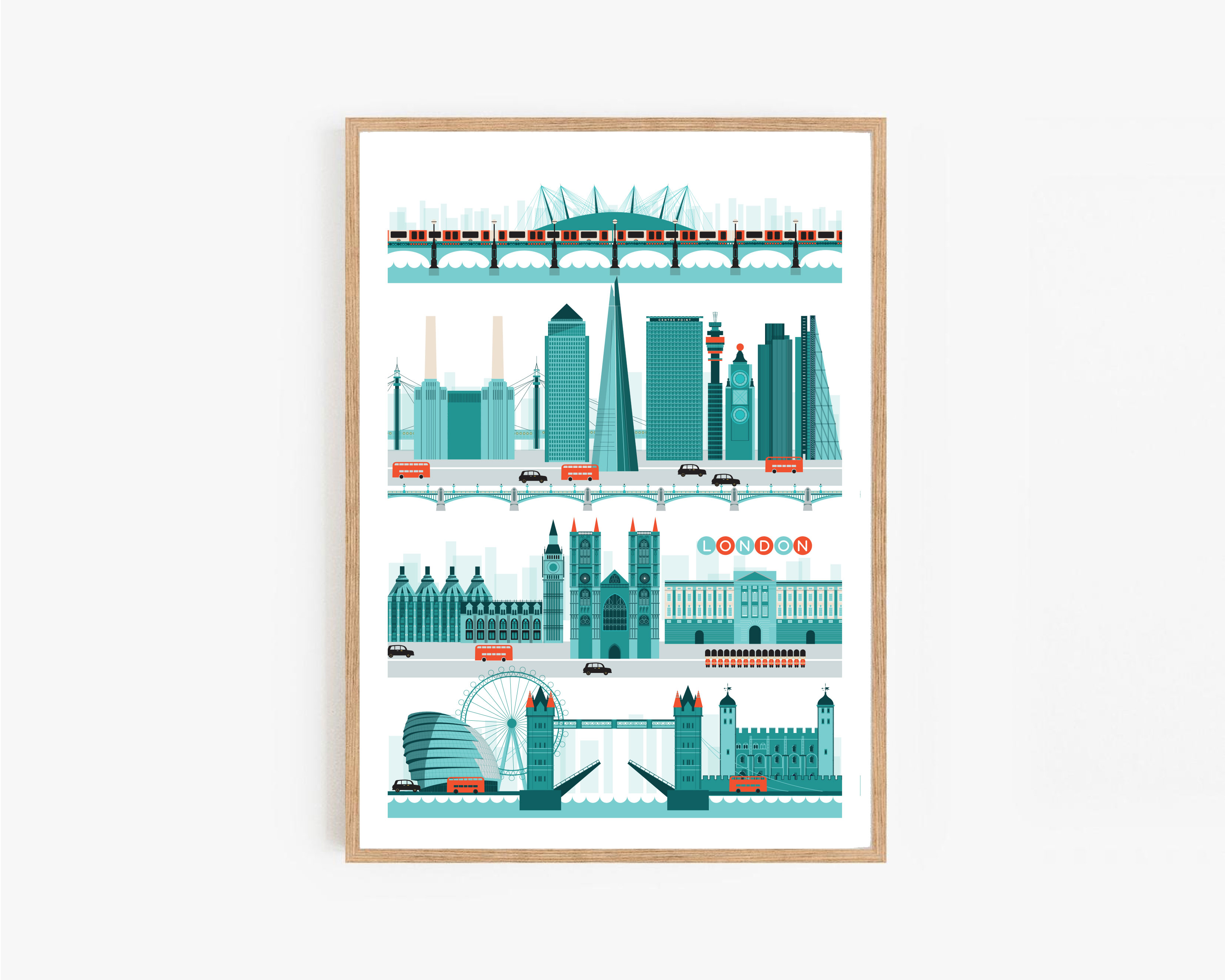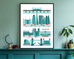 Immerse yourself in the architectural splendour of London with this “Graphical London” illustration, expertly designed in a sleek, modern graphic style. This captivating piece of art features a collection of London’s most famous structures, from the historic Tower Bridge to the contemporary Shard, all presented through a contemporary lens that highlights the city’s unique blend of the old and new.