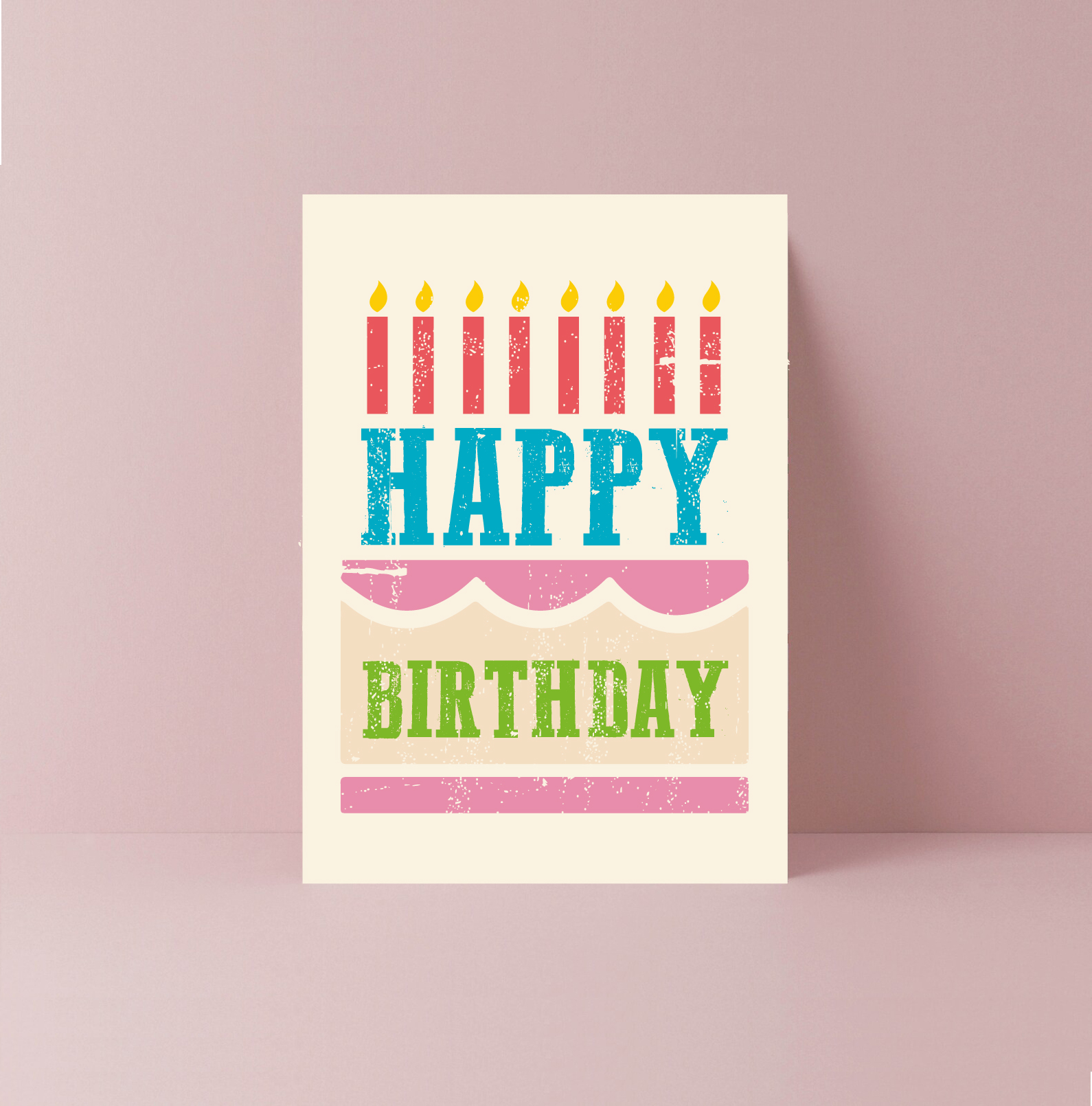 A simple, bold and cute cream greetings card in woodcut, letterpress style. It has been lovingly illustrated with the caption message ‘Happy Birthday’.