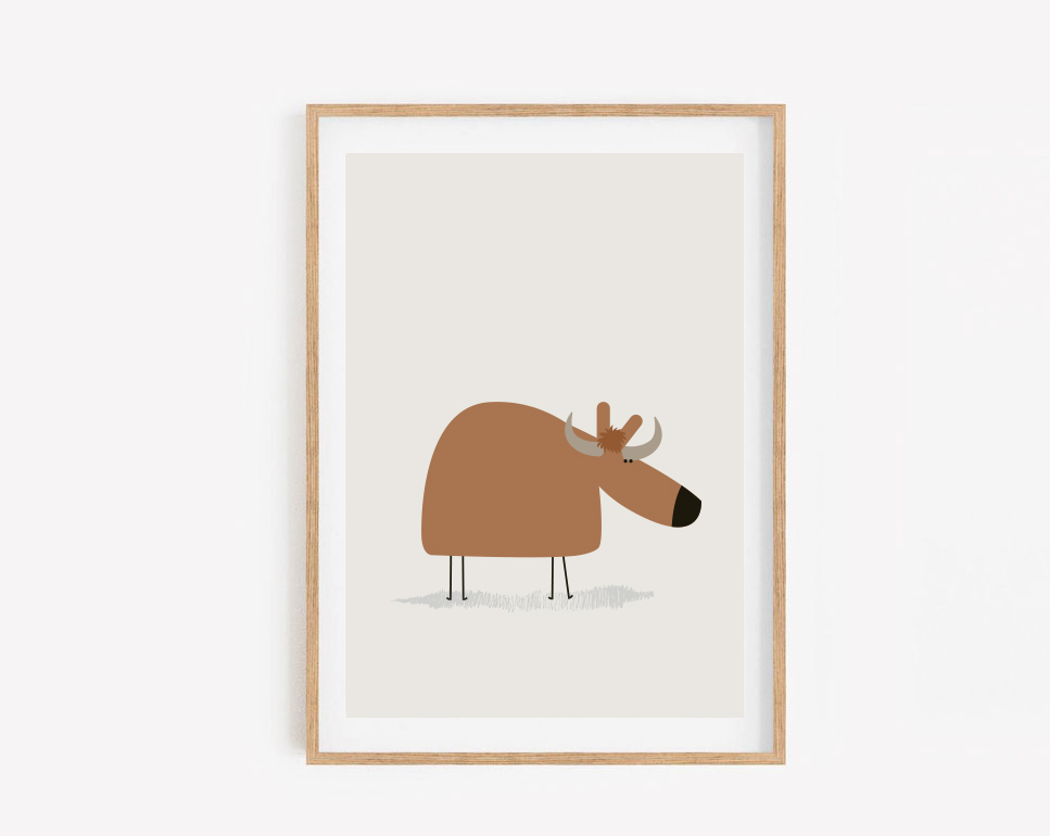 Create a warm, woodland-inspired space by pairing this yak print with other mountain or forest animals – think foxes, bears or owls – and accent with natural wood and warm neutrals for a calming, grounded feel.