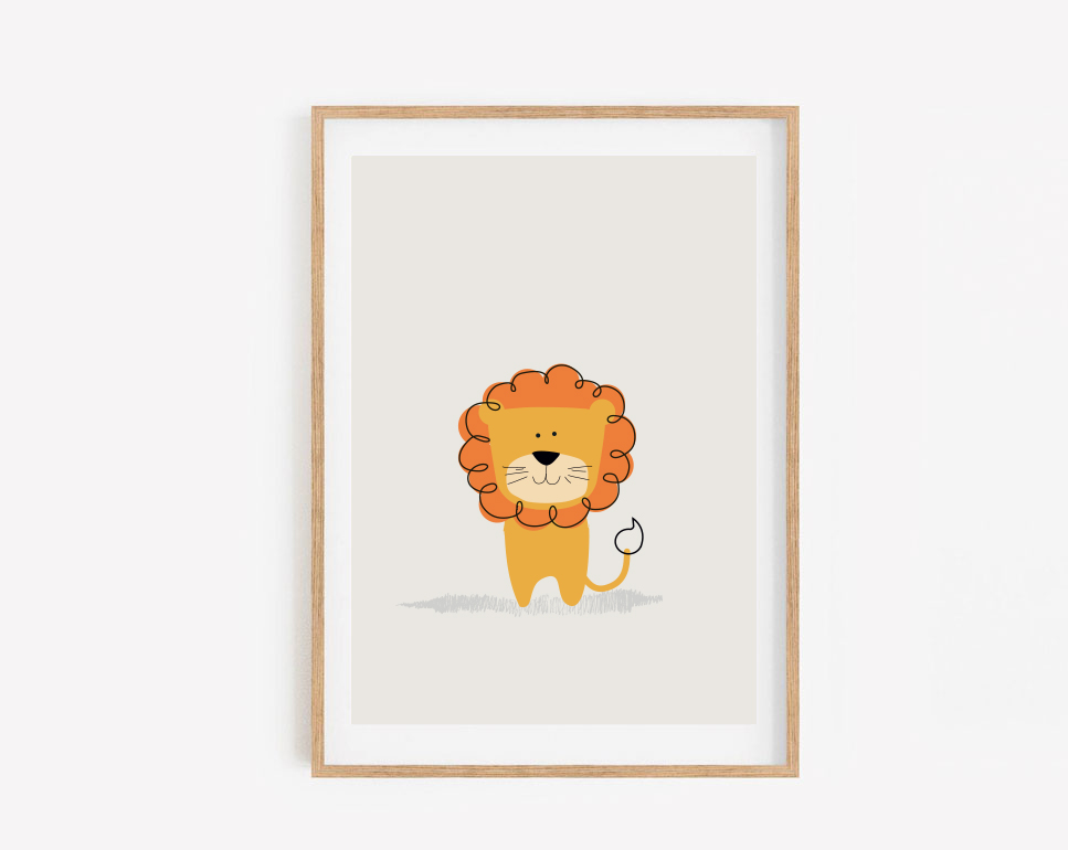 Happy, fun and colourful art for children and adults alike! A playful design featuring a beautiful Lion. It has been lovingly illustrated in my west london studio, and is part of a whole nursery prints collection. It is a perfect gift for a new baby or your little one. Looks fantastic in a child’s Nursery.