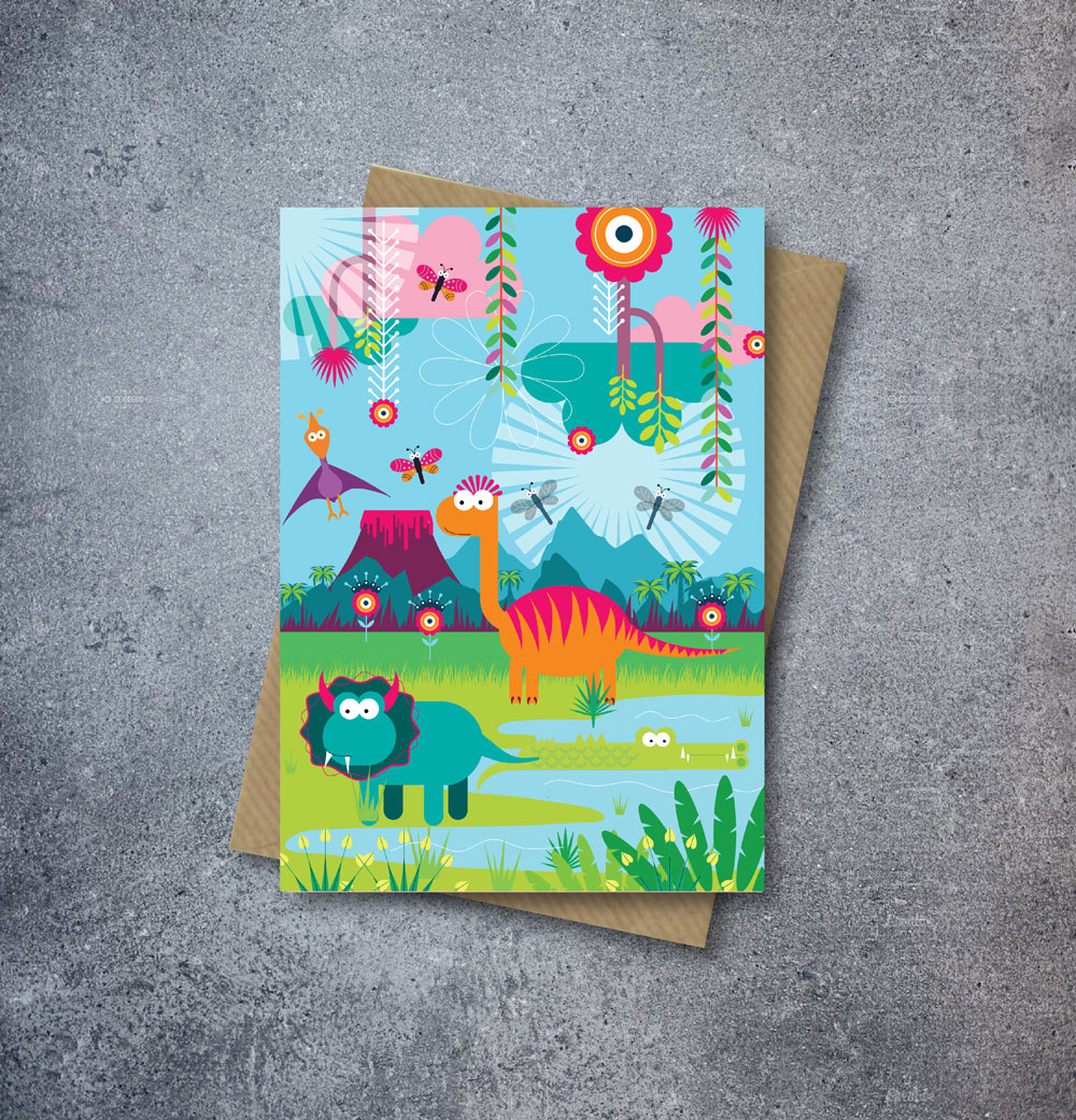 A simple, bold and cute tropical coloured greetings card with dinosaurs by a volcano. It has been lovingly illustrated by Studio Ladiebirdy, In West London.