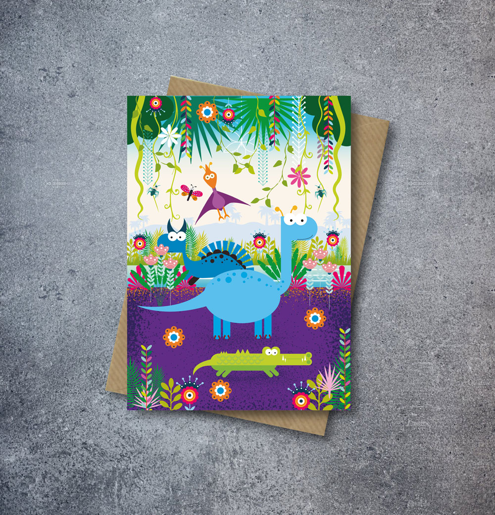 A simple, bold and cute purple and blue greetings card with dinosaurs in the Jungle Vines. It has been lovingly illustrated by Studio Ladiebirdy, In West London.