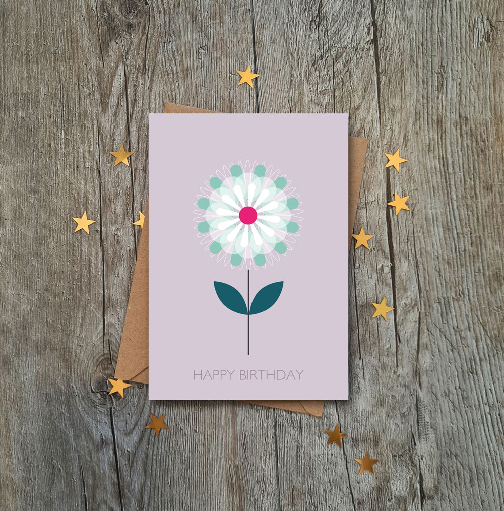 Beautiful Lavender Freesia Flower Birthday Card crested in a geometric design style. Designed and printed in London UK at Studio Ladiebirdy.