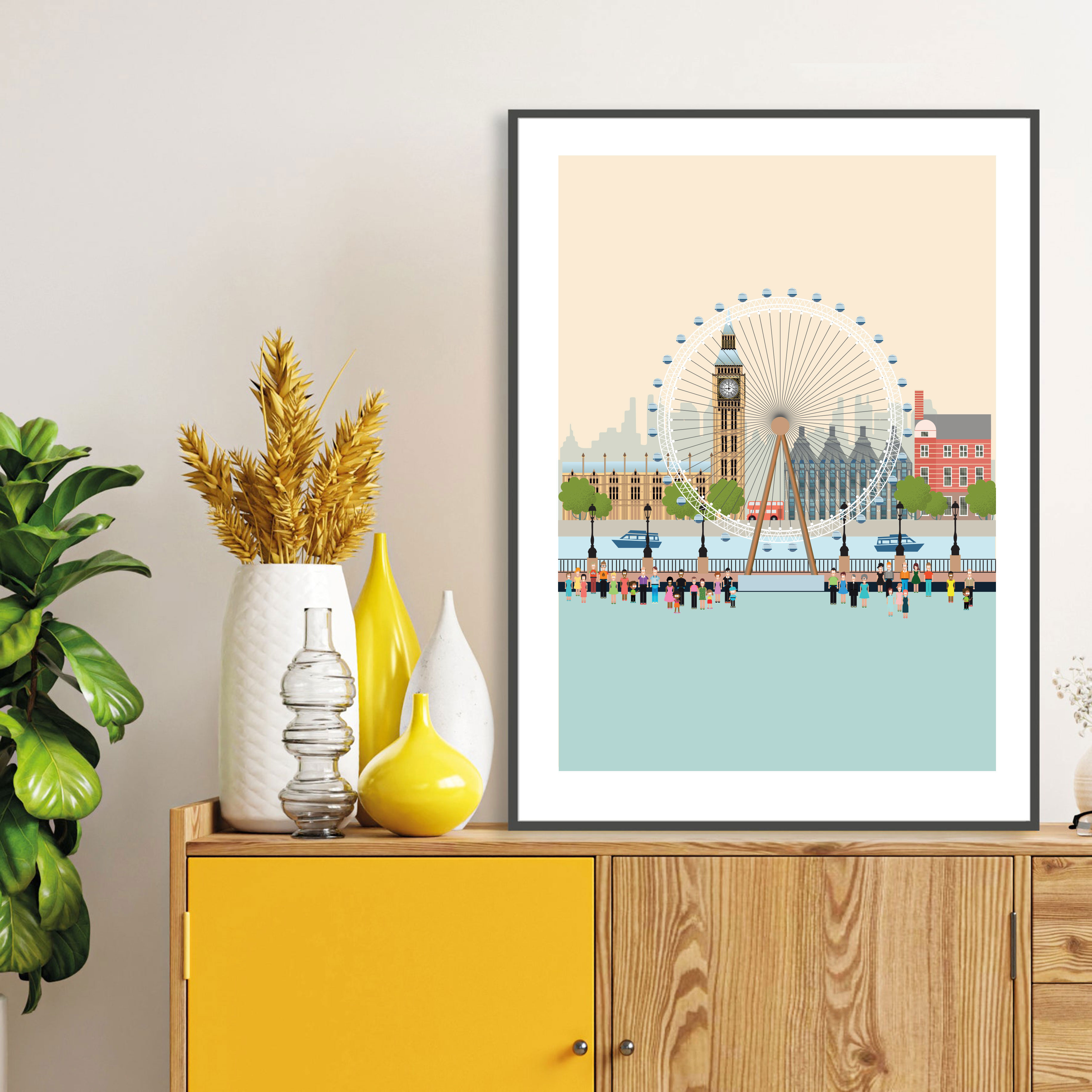 Update your space with this modern London Eye and Embankment illustration, rendered in a distinctive contemporary graphic style. This artwork captures the essence of one of London’s most scenic vistas, featuring the iconic London Eye and the bustling Embankment, reimagined through bold lines and a minimalist aesthetic.