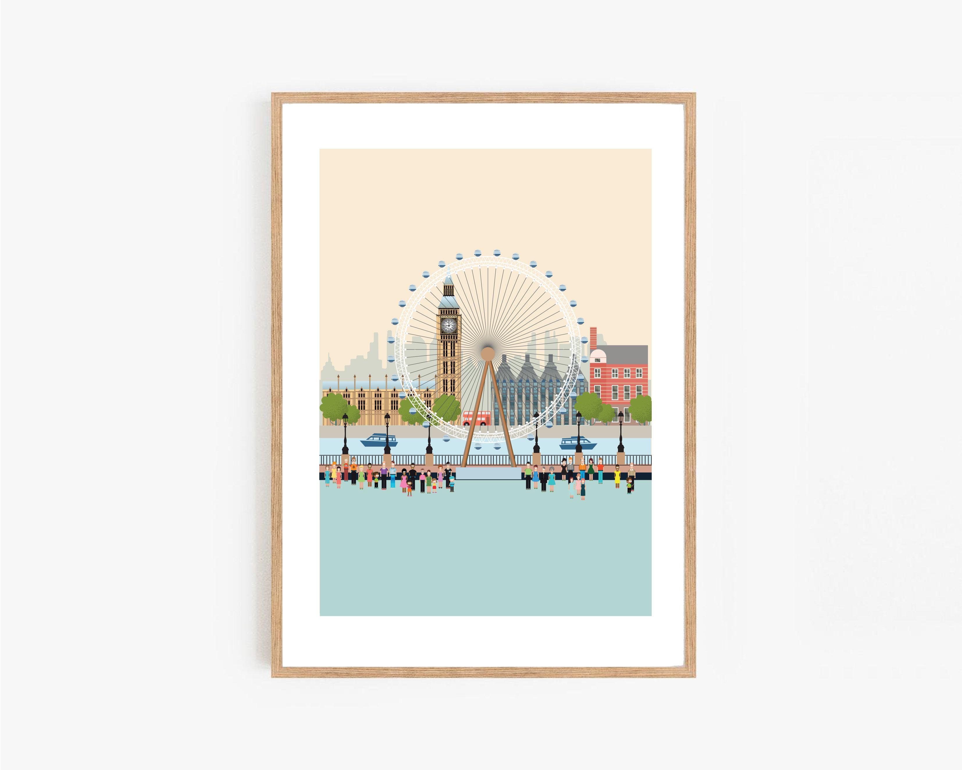 Ideal for lovers of modern art and urban landscapes, this illustration offers a fresh perspective on a well visited London scene. Whether you’re decorating a home, an office, or giving a gift, this London Eye and Embankment  Illustration is sure to captivate and inspire. This print is available in both A3 ad A4 sizes.