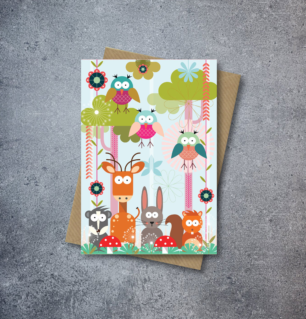 A simple, bold and cute light blue greetings card with woodland creatures. It has been lovingly illustrated by Studio Ladiebirdy in West London.