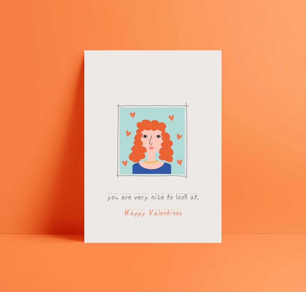 Celebrate Valentine’s Day with a card that’s charming, playful, and full of personality. This adorable card features a cute headshot illustration of a red-haired lady with wavy hair, giving it a modern and vibrant look that instantly catches the eye. The design is cheerful, friendly, and stylish, making it a perfect choice for anyone who appreciates thoughtful, unique Valentine’s cards that stand out.