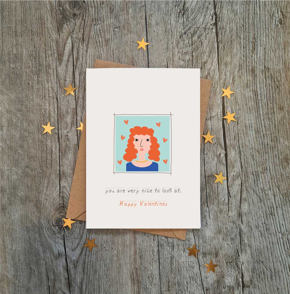 The front of the card carries the flattering and lighthearted message: ” you are very nice to look at”, and “Happy Valentines”, It’s a sweet, playful way to show someone you admire them, bringing a smile to their face and a little joy to their day. Whether it’s for a romantic partner, spouse, crush, or a special friend, this card blends humor and sincerity in a way that feels genuine and memorable.