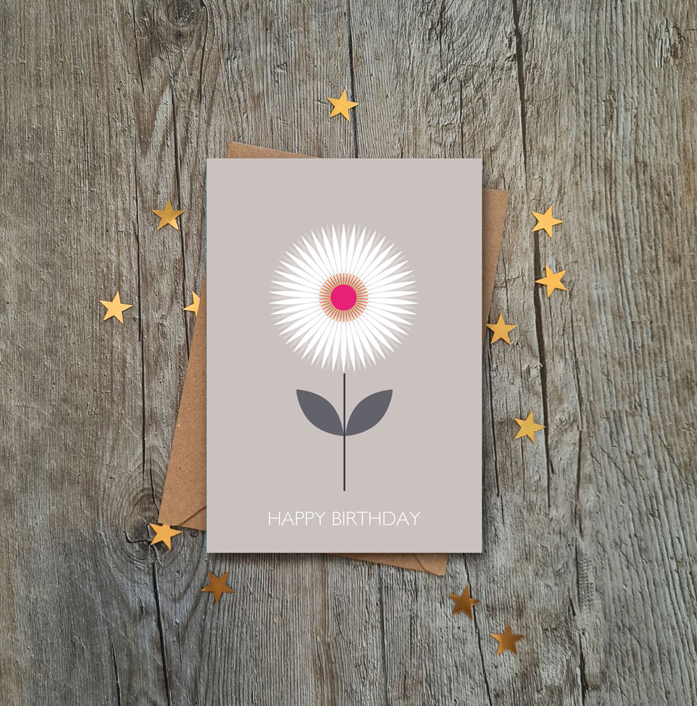 Elegant and stylish =white and cerise Gerber daisy Birthday card. Designed and printed in London UK at Studio Ladiebirdy.